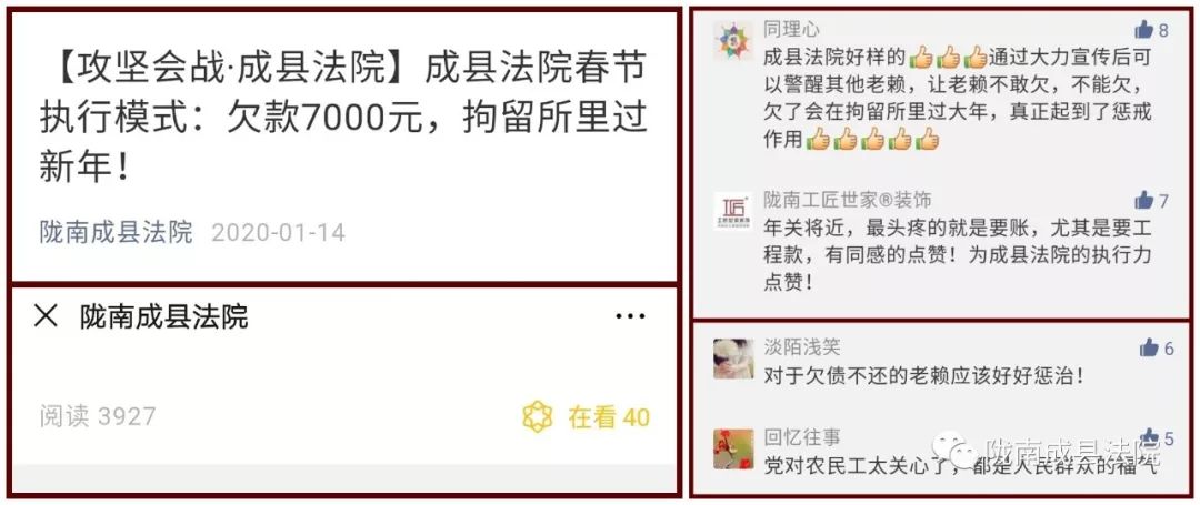 杜某某称其朋友昨天看到成县法院发布的微信,7000块钱没还就被拘留了15天,不但丢人现眼,过年都得在拘留所,所以朋友劝她早点主动来履行义务。