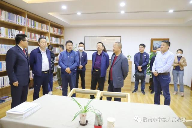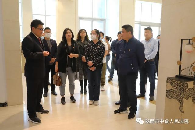 4月26日,陇南市公共资源交易中心党组书记、副主任姜五军一行在市法院党组成员、政治部主任刘鑫,以及研究室负责同志陪同下,到市法院开展法治文化建设观摩交流活动。