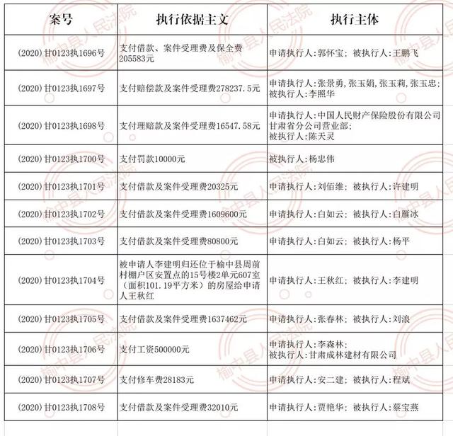 【鼎立信】榆中法院10月9日至10月13日被执行人名单