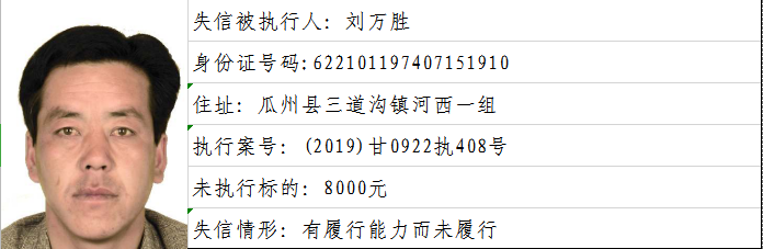 为进一步制裁规避执行行为,保障胜诉当事人合法权益,推进社会诚信体系建设,依照《中华人民共和国民事诉讼法》、《最高人民法院关于公布失信被执行人名单信息的若干规定》等有关规定,现对一批已经进入执行程序且尚未全部履行义务的被执行人进行公开曝光,敦促所有被执行人自觉履行生效法律文书确定的义务,并欢迎广大人民群众向瓜州县人民法院执行指挥中心举报被执行人财产线索和下落。举报电话:0937-5945732