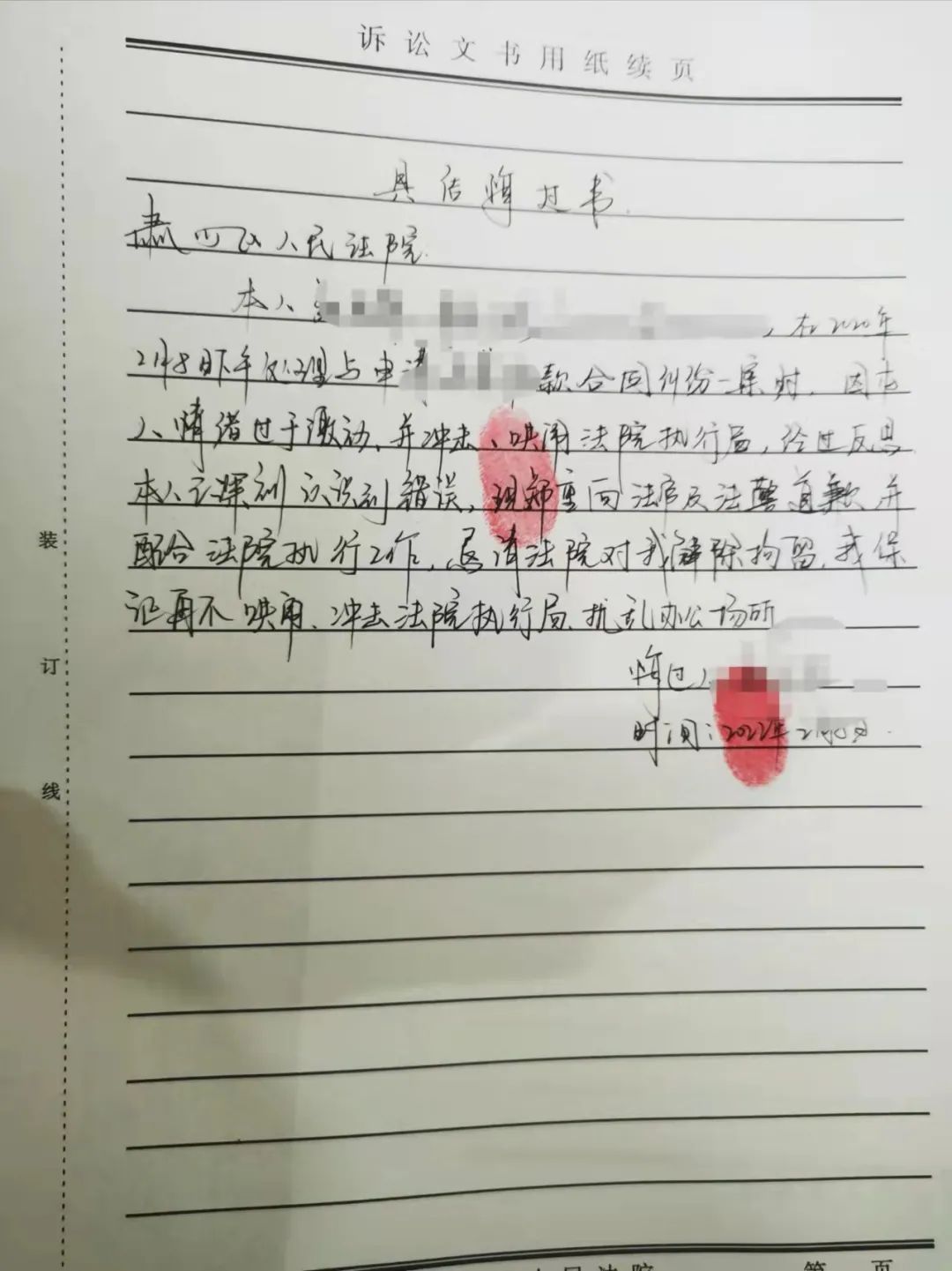2022年1月13日,本院受理执行马某与张某借款合同纠纷一案,承办法官在向被执行人张某送达执行通知书后,将张某名下微信、支付宝、银行卡冻结,并划拨其名下存款一万余元。2月8日,张某到本院执行局要求法院解除对其名下微信、支付宝、银行卡的冻结,声称:“肃州区人民法院的执行措施致使其无法正常生活,如果肃州区法院不解除对其名下微信、支付宝、银行卡的冻结,我将向信访局、纪委监委和甘肃省高级人民法院等部门反映你们的过度执行”。在承办法官明确向其告知要求解除微信、支付宝和银行卡的要求不符合法律规定后,被执行人张某情绪激动随即哄闹法庭,声称自己有精神疾病,要求退还所有扣划款并解除微信、支付宝和银行卡的冻结。承办法官与法警多次尝试与被执行人张某沟通无果后,依法对被执行人采取司法拘留措施,在带上手铐后被执行人幡然悔悟,向承办法官及法警道歉并当面书写具结悔过书,恳请法院不要采取拘留措施。