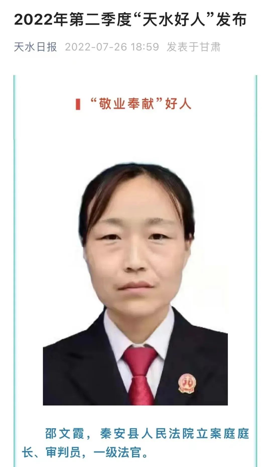 喜讯!秦安法院法官邵文霞荣获2022年第二季度“天水好人”称号