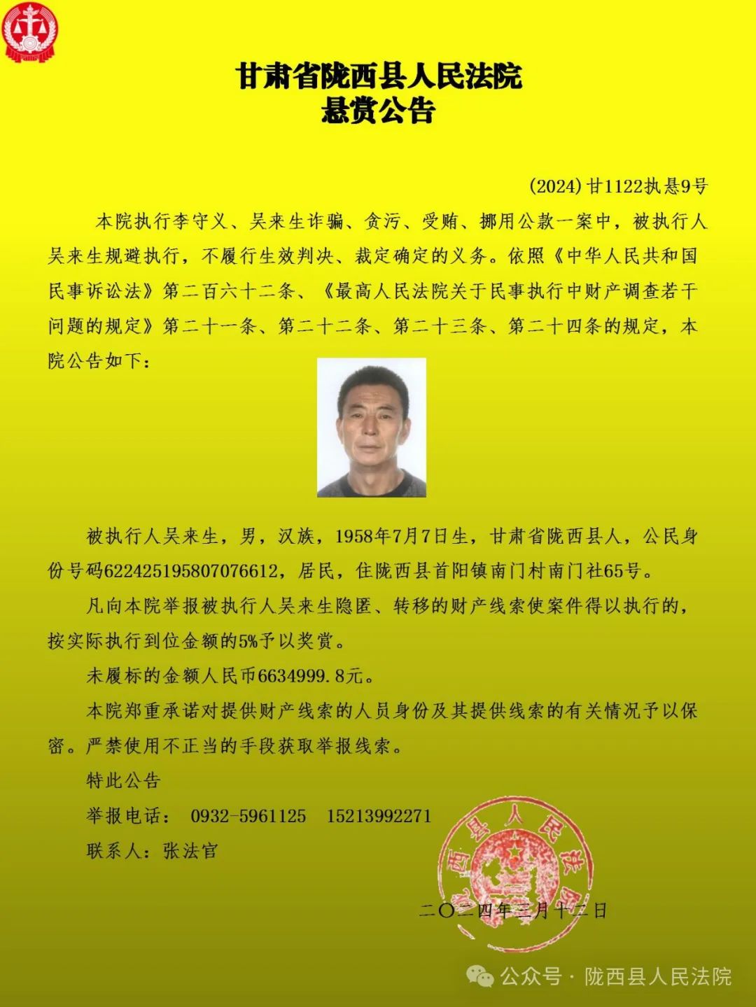 - 2024-03-13张掖民乐县法院悬赏公告