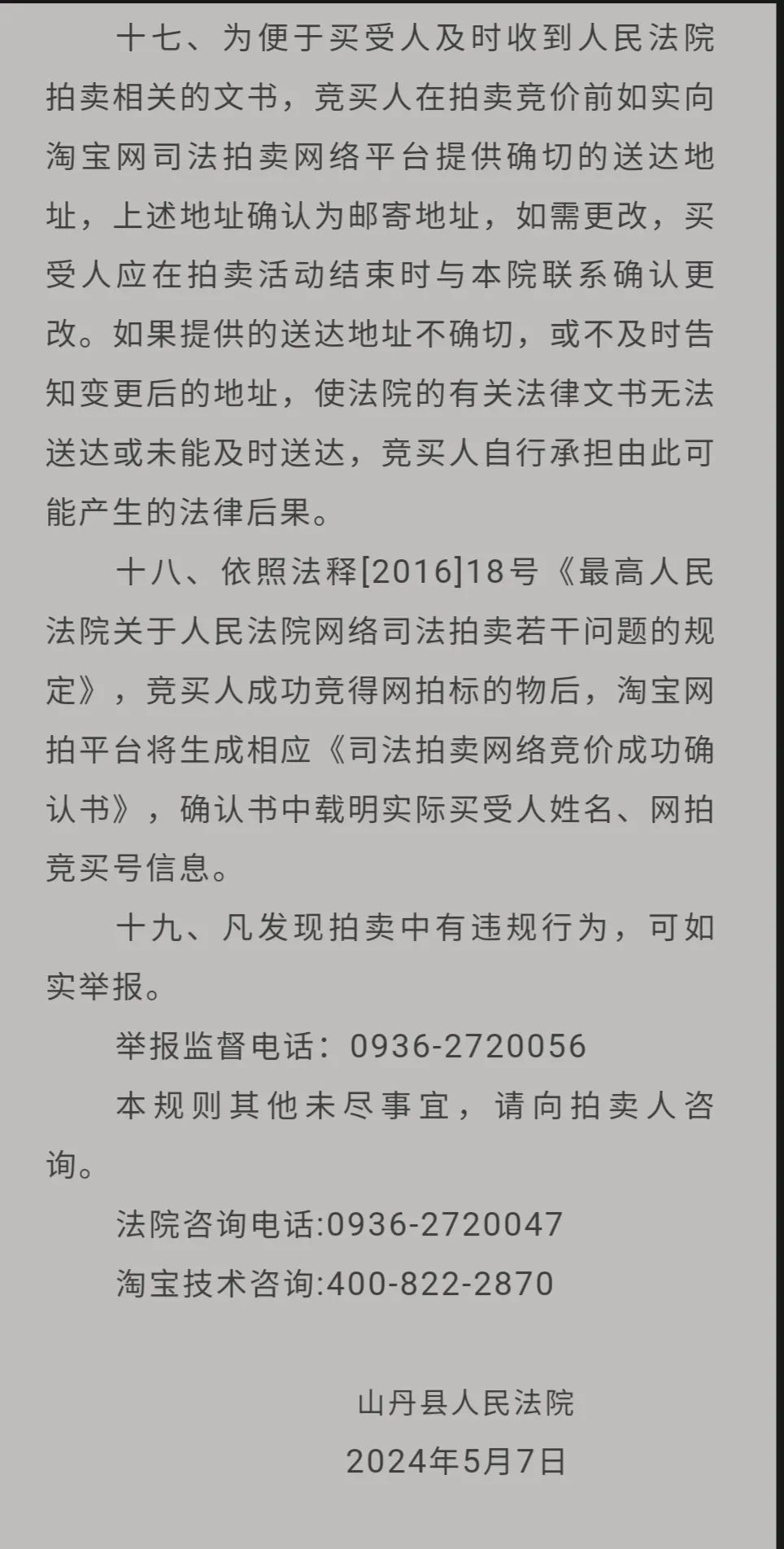 甘肃省山丹县人民法院将于2024年6月8日10时至2024年6月9日10时止(延时的除外),在甘肃省山丹县人民法院阿里巴巴司法拍卖网络平台上进行公开拍卖活动(法院账户名:山丹县人民法院)现公告如下: