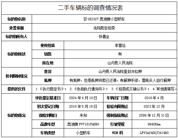 张掖山丹县法院关于拍卖号牌为甘GX2327奥迪牌小型轿车的公告
