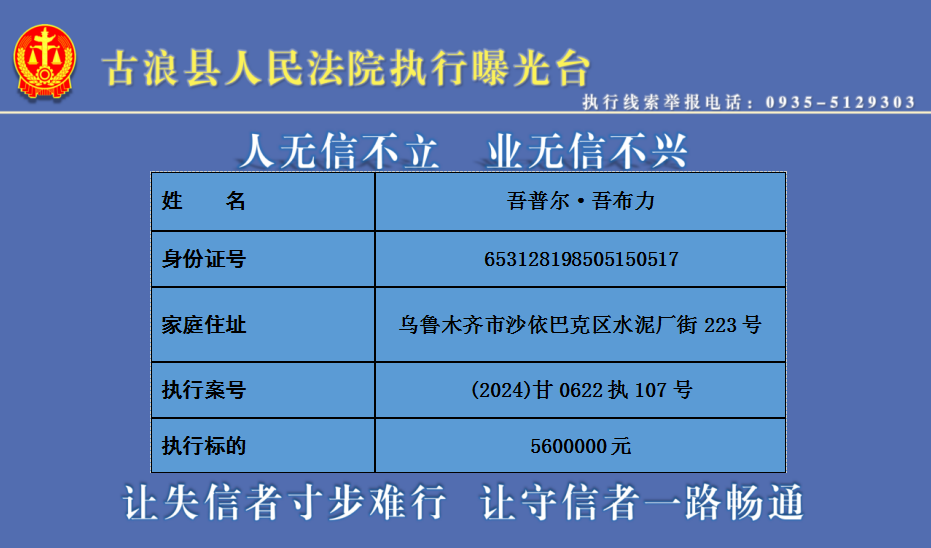 根据中共中央宣传部、最高人民法院、中国银行业监督管理委员会联合下发的《创建完善失信被执行人曝光平台的通知》和最高人民法院《关于公布失信被执行人名单信息的若干规定》,为维护法律尊严和权威,弘扬社会诚信风气,现将甘肃省古浪县人民法院纳入失信被执行人名单的被执行人,予以信用惩戒公开曝光,下列失信人员及法人自纳入失信名单起: