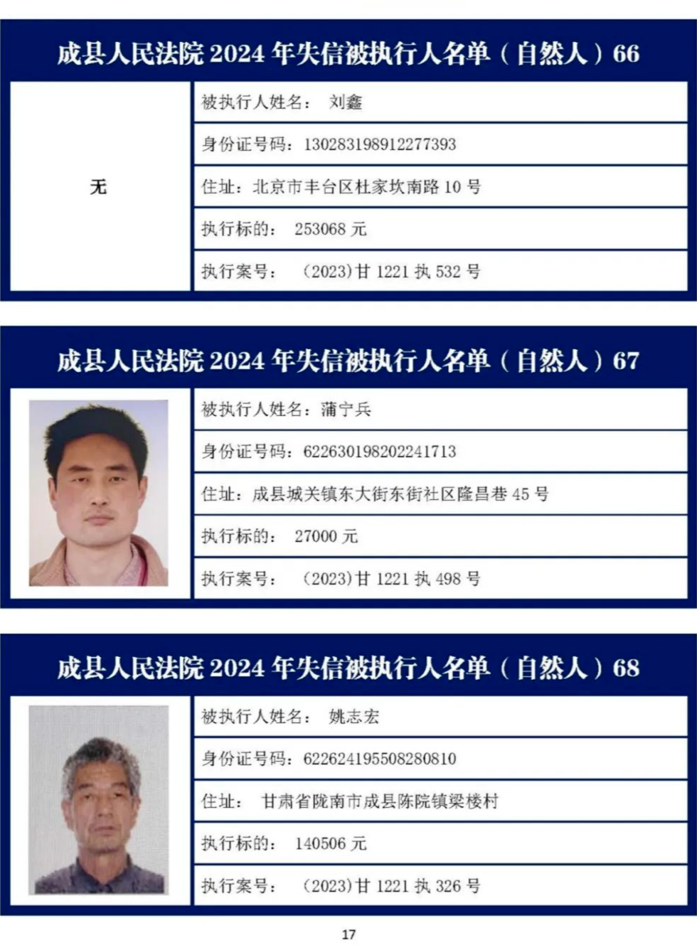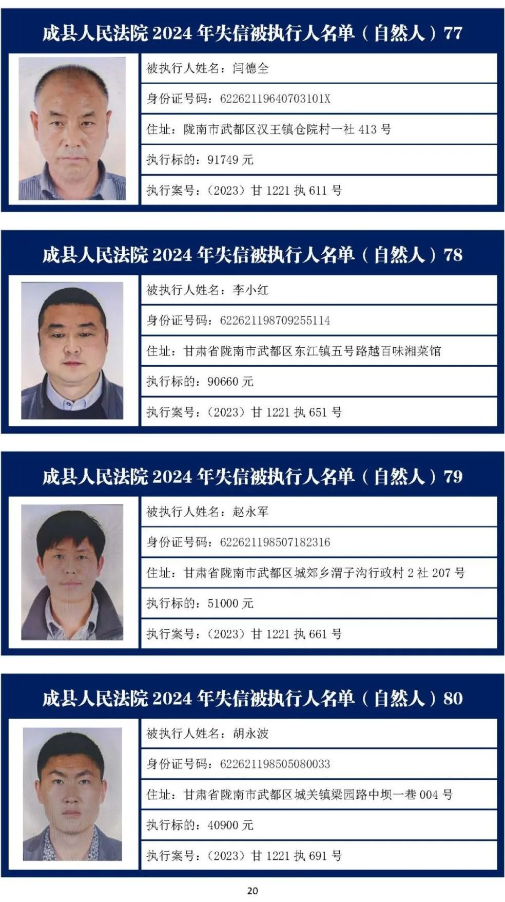 - 2024-06-13陇南成县法院曝光新一批失信被执行人名单