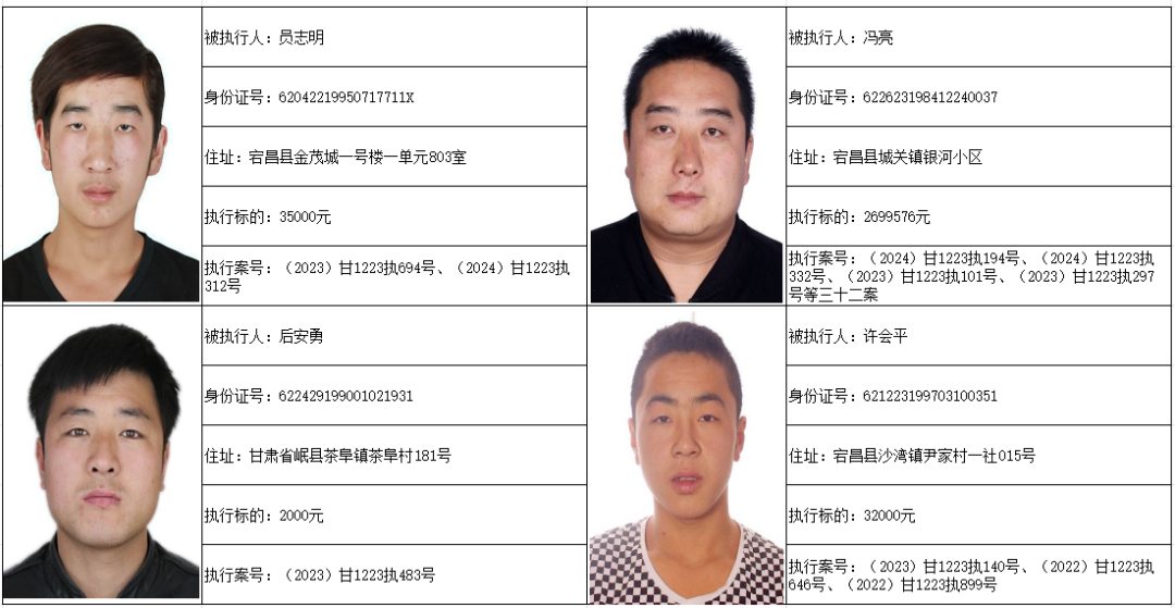 为切实保护债权人的合法权益,维护法律尊严,促使被执行人履行生效法律文书确定的义务,建立诚实守信的法治环境,推进社会主义诚信体系建设,有效履行法院生效法律文书,根据《最高人民法院关于公布失信被执行人名单信息的若干规定》,现将宕昌县人民法院24名失信被执行人人员名单予以公布。希望公布的失信被执行人能够诚实守信、遵守法律,积极履行人民法院裁判文书确定的义务。