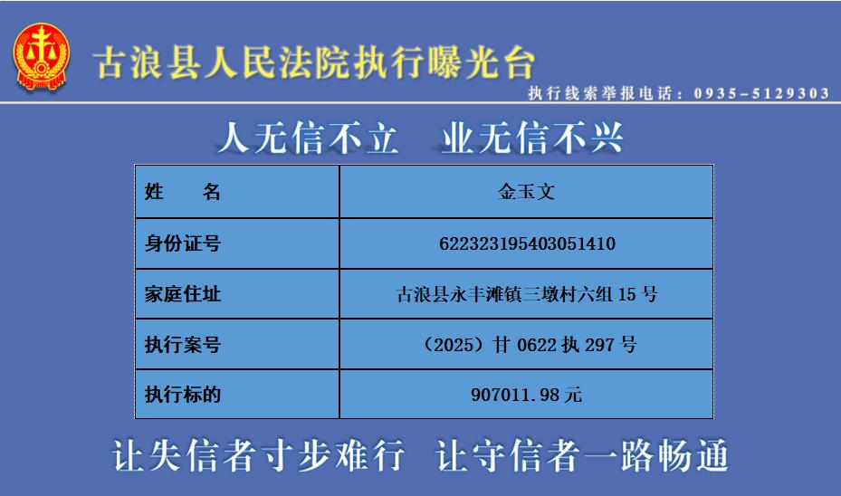 根据中共中央宣传部、最高人民法院、中国银行业监督管理委员会联合下发的《创建完善失信被执行人曝光平台的通知》和最高人民法院《关于公布失信被执行人名单信息的若干规定》,为维护法律尊严和权威,弘扬社会诚信风气,现将甘肃省古浪县人民法院纳入失信被执行人名单的被执行人,予以信用惩戒公开曝光,下列失信人员及法人自纳入失信名单起: