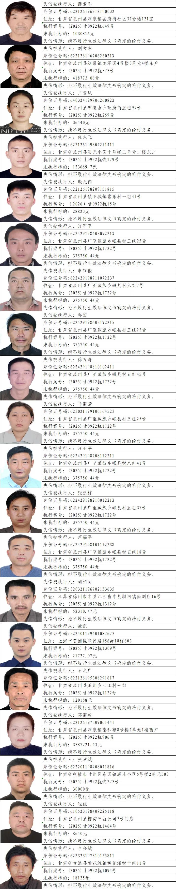 - 2026-02-13兰州曝光6名“老赖”,拒不履行法院生效裁判